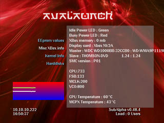 Avalaunch contains several submenu items that display everything about your xbox hardware and eeprom information.